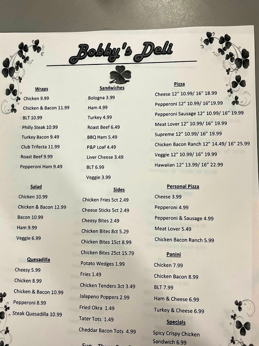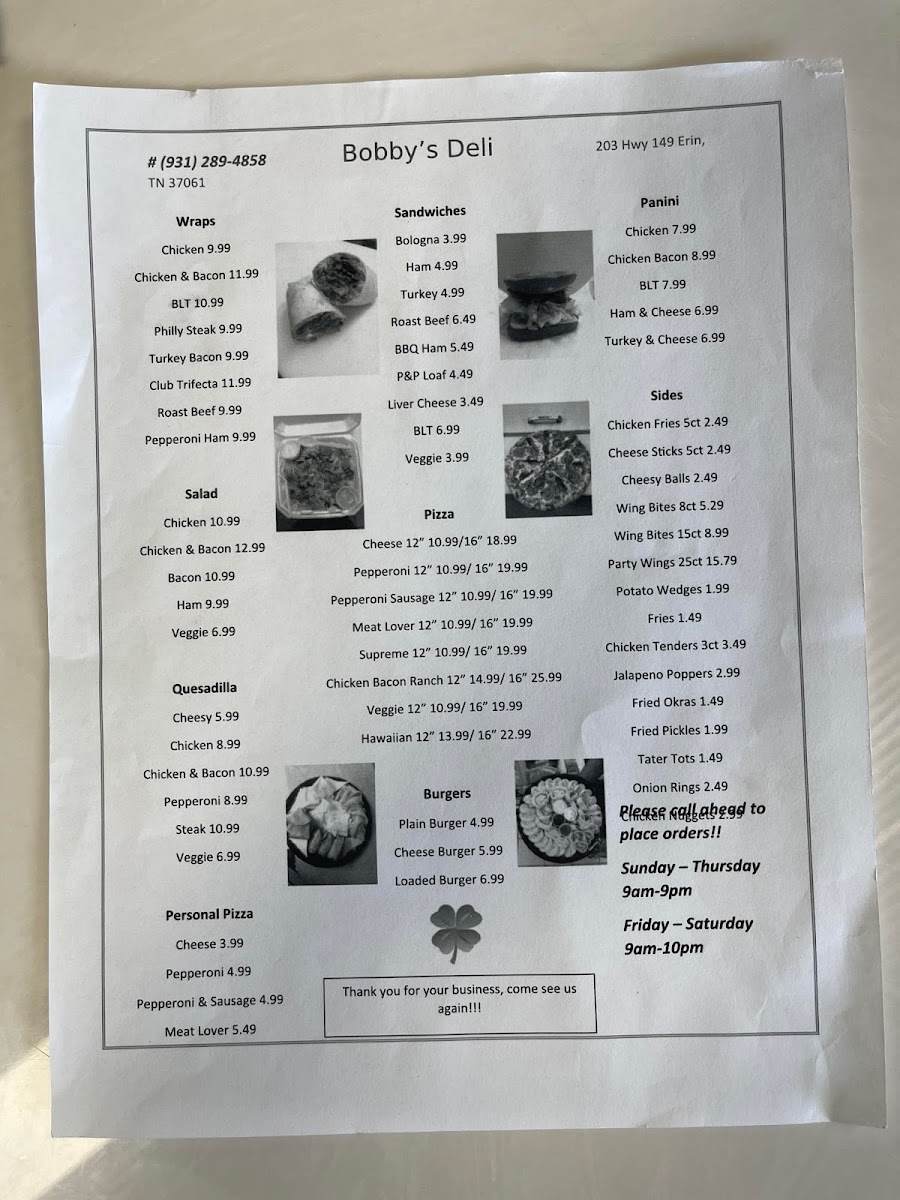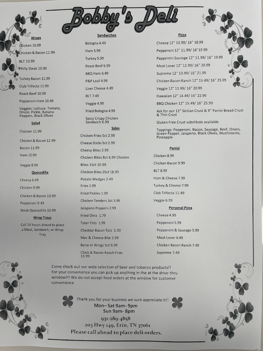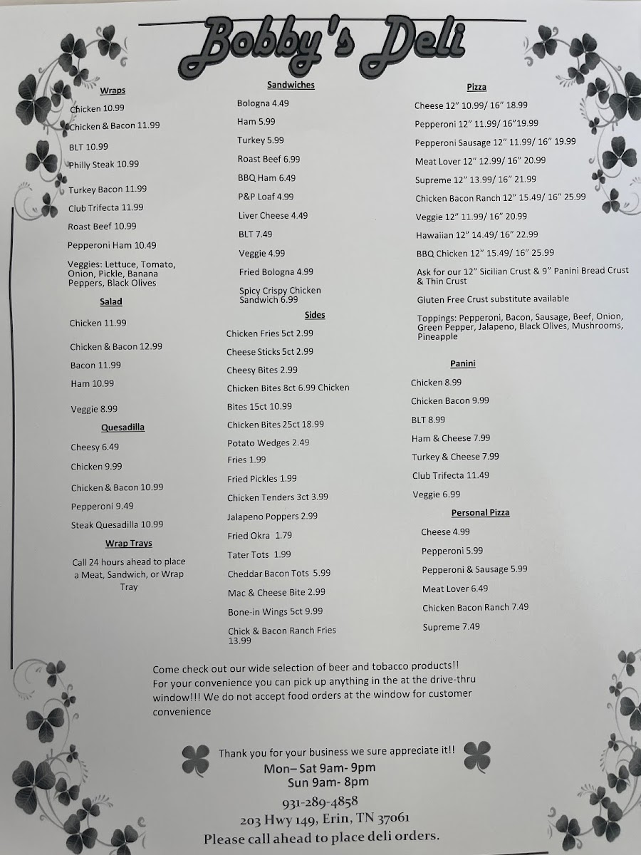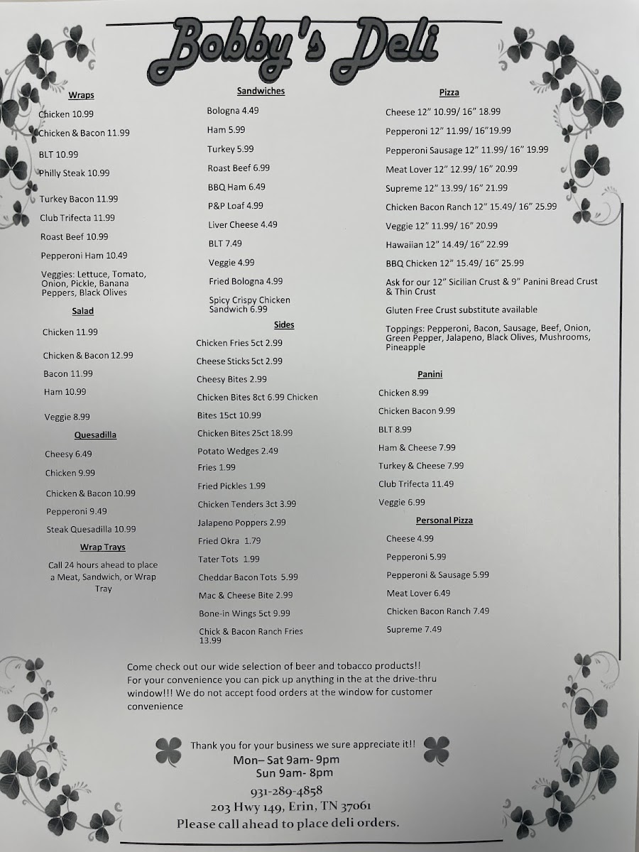 If you’re in the mood for a delicious and hearty meal, Bobby’s Deli Menu offers just what you’re craving. Located at 203 TN-149 in Erin, TN, this spot serves up an incredible variety of comfort food. Whether you're in the mood for a classic deli sandwich, a warm, satisfying soup, or a fresh salad, Bobby’s Deli has something for everyone. The menu highlights include a range of tasty sandwiches, all piled high with quality meats and paired with house-made dressings. If you're feeling extra hungry, their platters are sure to fill you up. And let’s not forget about their signature sides, which are the perfect complement to any meal. With an inviting atmosphere and food that feels like it’s made just for you, Bobby’s Deli is a go-to spot for locals and visitors alike.